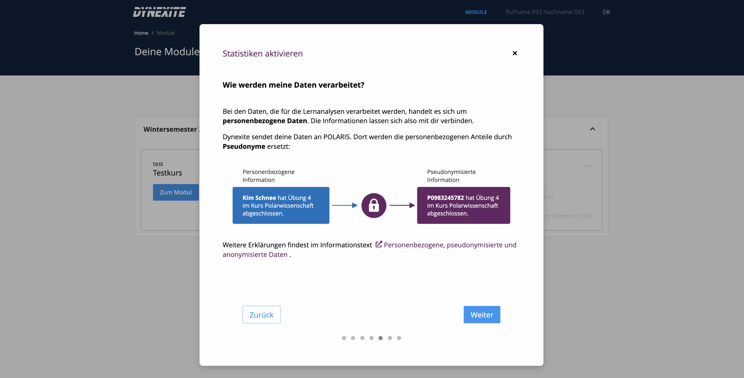 Für Studierende der RWTH sind Learning Analytics ein freiwilliges Angebot. Sie können selbst entscheiden, ob sie die Statistiken aktivieren möchten. Diese informierte Einwilligung ist in einem Systemdialog umgesetzt, der die Studierenden über Lernanalysen mit POLARIS, die pseudonyme Verarbeitung ihrer Daten, die Freiwilligkeit der Aktivierung und weiterführende Informationsangebote aufklärt.