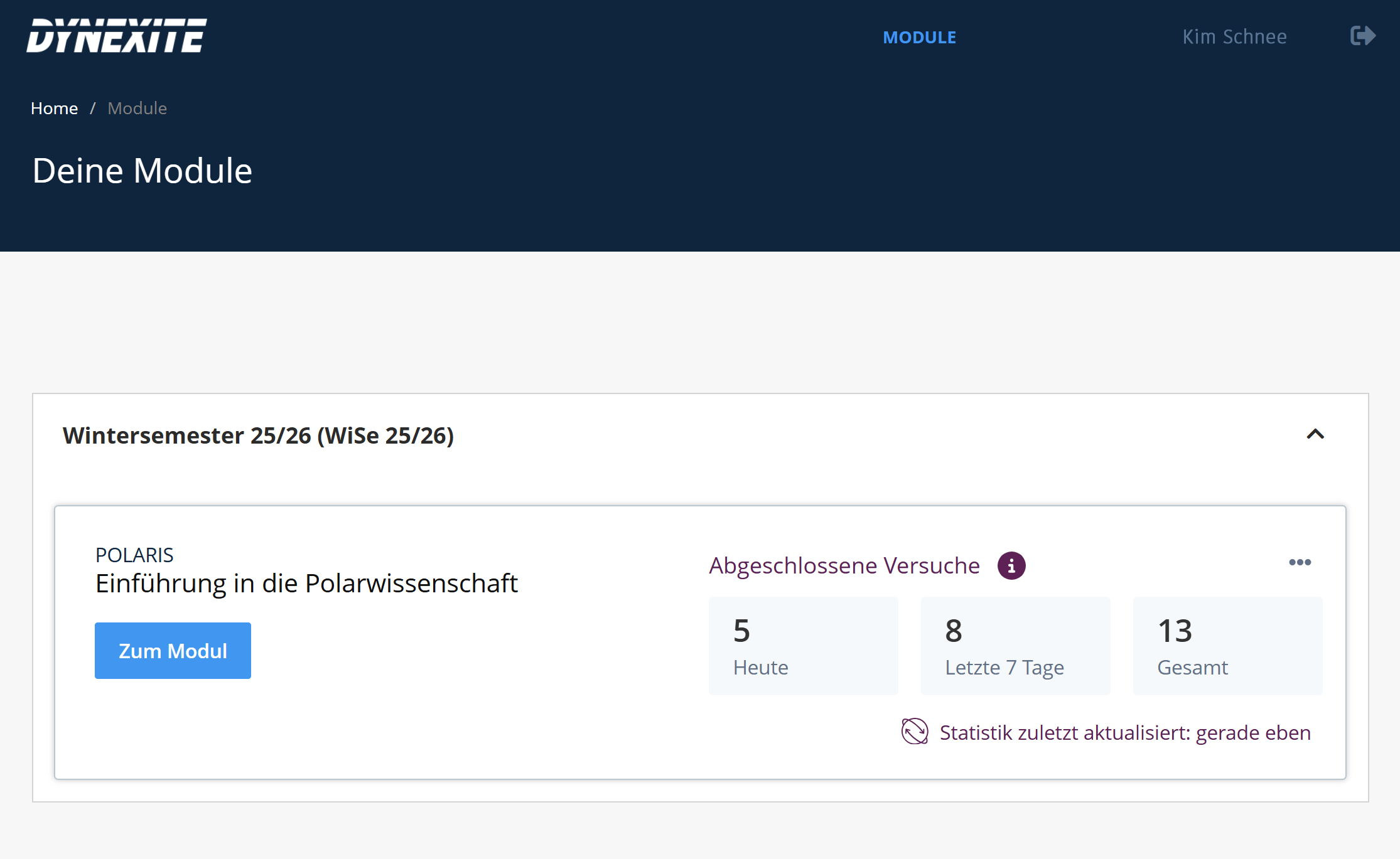 Das Dashboard ist direkt in die Kursübersicht in Dynexite integriert. Studierende können nun sehen, wie viele Versuche sie am aktuellen Tag, in den letzten sieben Tagen und insgesamt abgeschlossen haben.