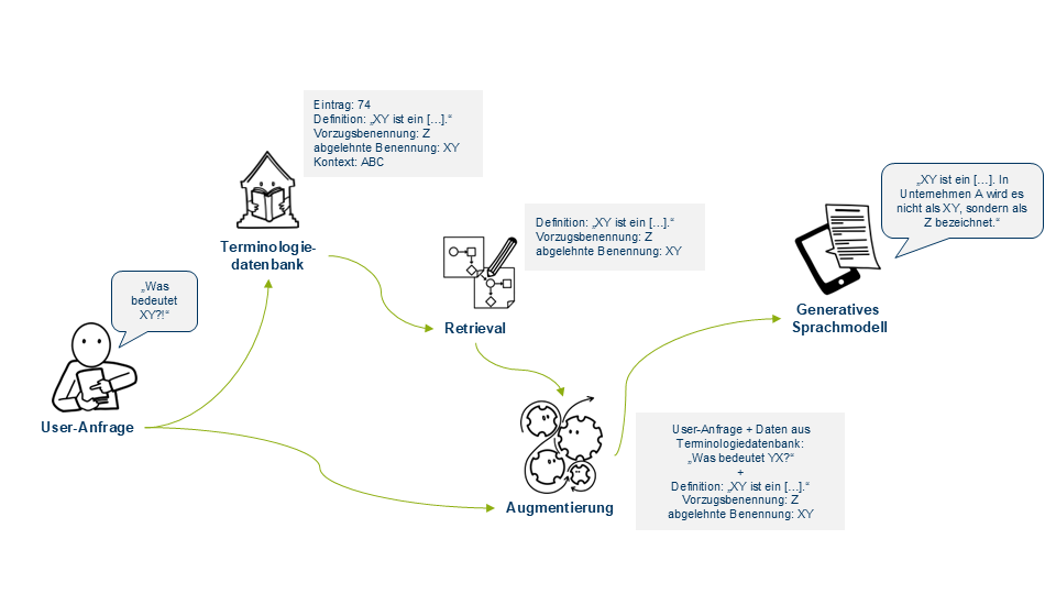 Wenn Nutzer*innen also eine Anfrage an ein generatives Sprachmodell stellen, wird diese nicht direkt an das Sprachmodell gesendet, sondern zunächst mit der Terminologiedatenbank verglichen, um so relevante Informationen für die Anfrage herauszufiltern (Retrieval). Gibt es relevante Informationen in der Datenbank, wird die ursprüngliche User-Anfrage mit den zusätzlichen Daten angereichert (Augmentierung). Erst jetzt wird die Anfrage an das Sprachmodell weitergegeben. Anschließend wird eine Antwort, basierend auf den allgemeinen Trainingsdaten und den spezifischen Daten aus der Terminologiedatenbank, generiert (Generierung).